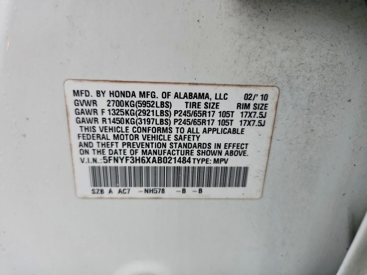 5FNYF3H6XAB021484